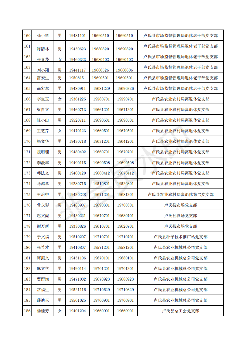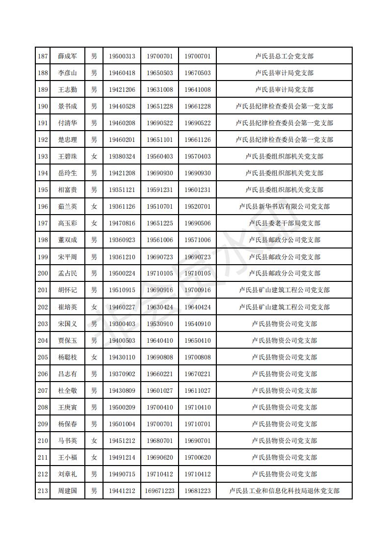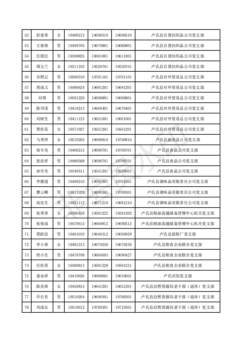按照中共卢氏县委组织部《关于做好“光荣在党50年”纪念章颁发工作的通知》要求,现对县直工委截止2021年7月1日党龄达到50周年、健在的老党员名单进行公示,公示时间2021年6月3日-7日,公示期间,如发现有遗漏或其他情况,请致电0398-7872788。