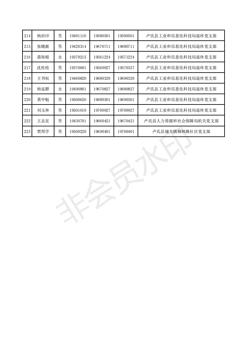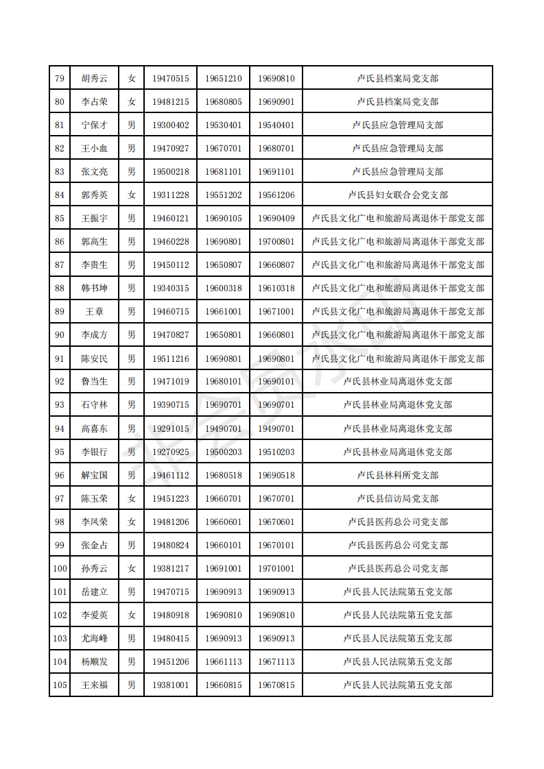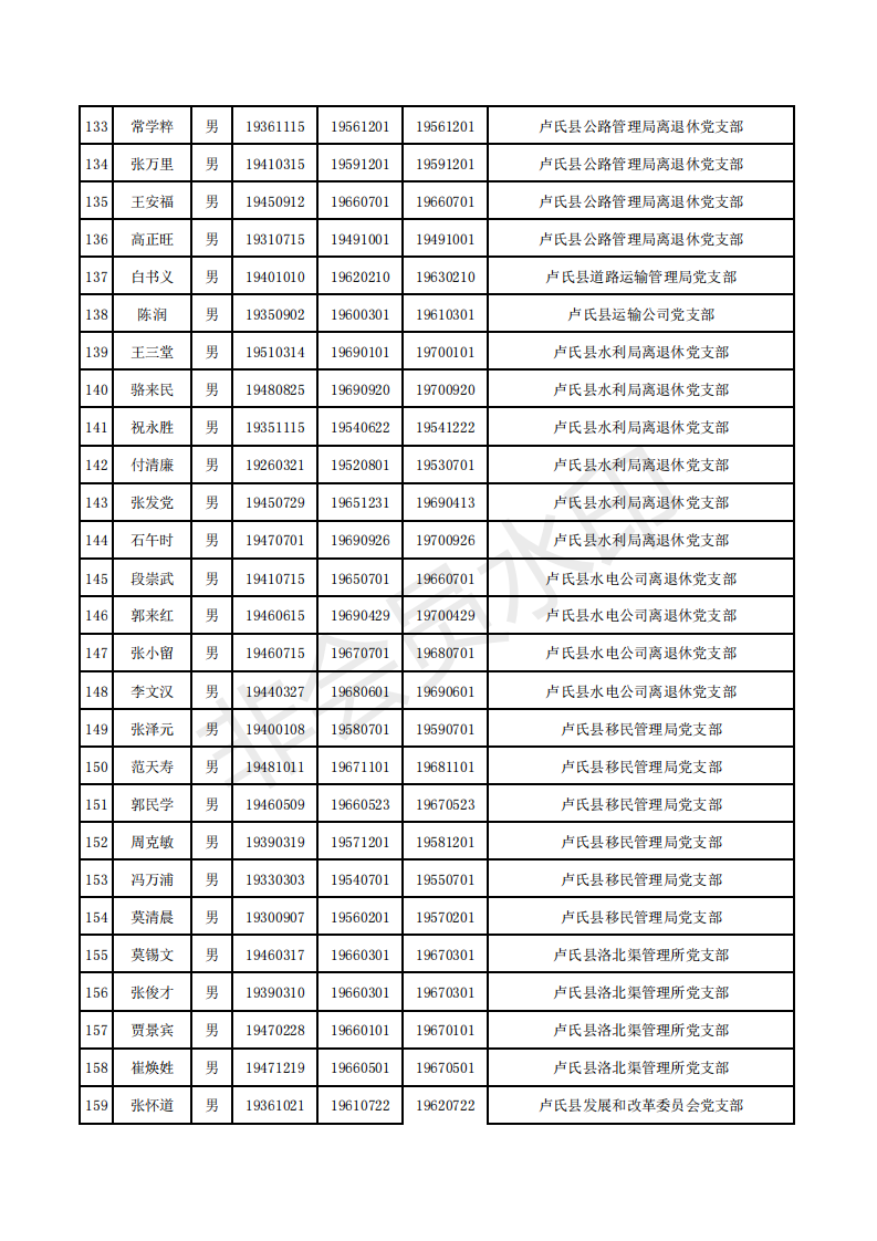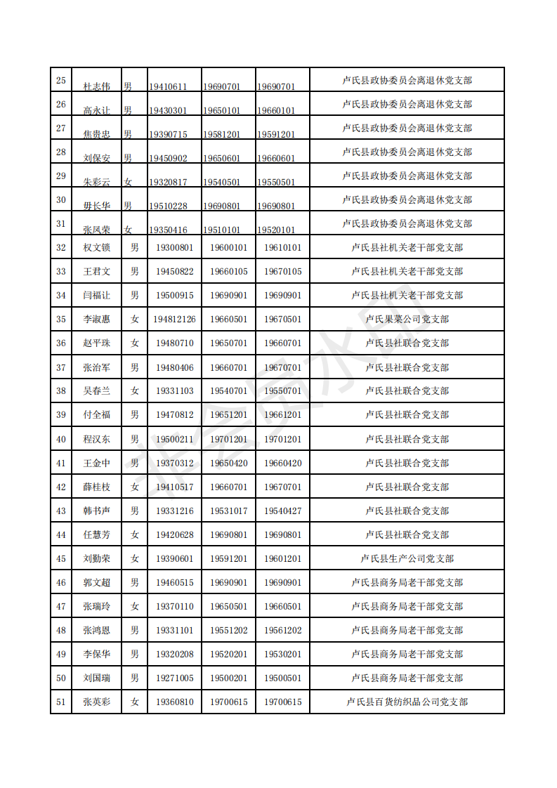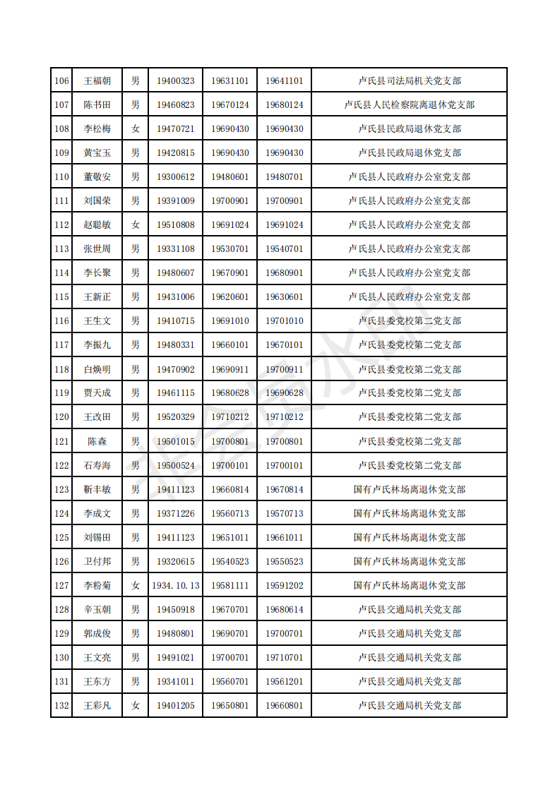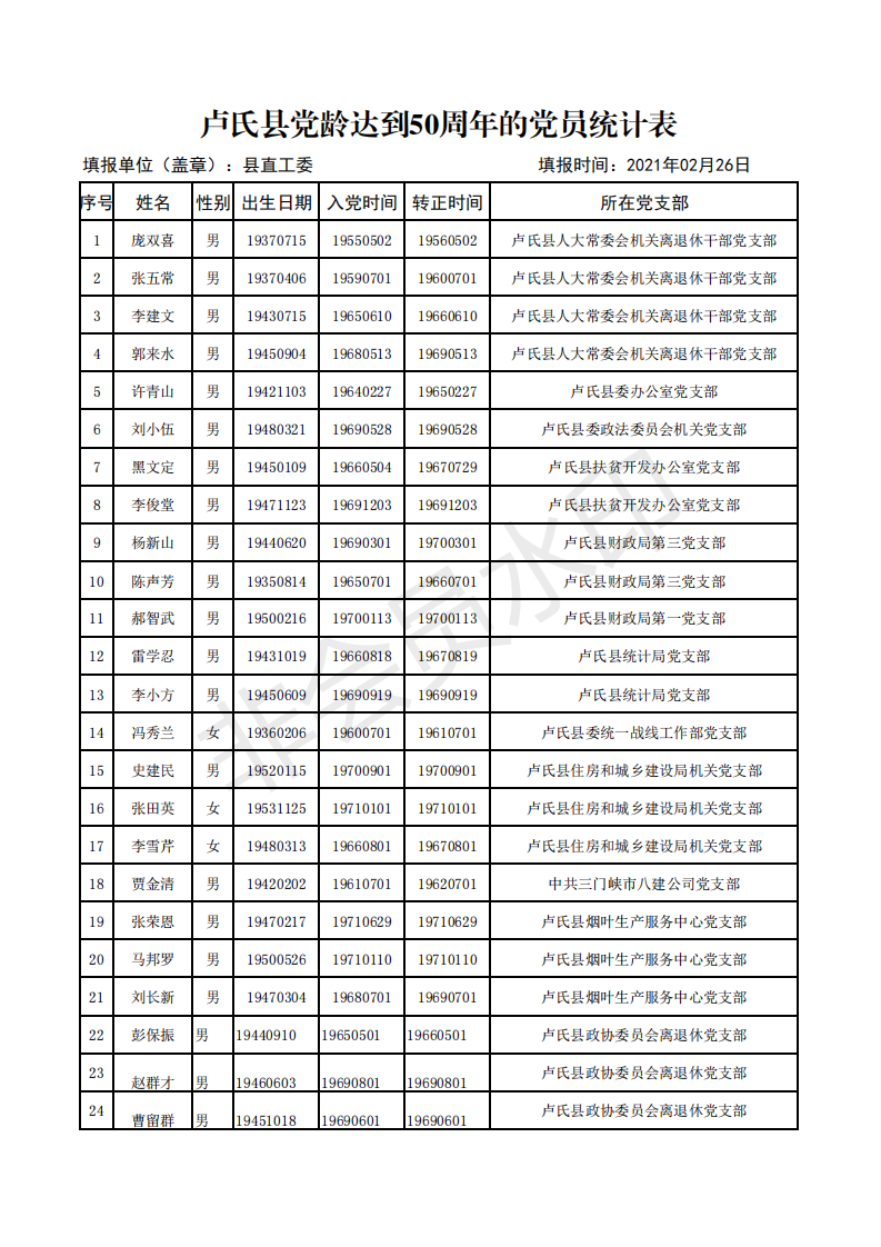 按照中共卢氏县委组织部《关于做好“光荣在党50年”纪念章颁发工作的通知》要求,现对县直工委截止2021年7月1日党龄达到50周年、健在的老党员名单进行公示,公示时间2021年6月3日-7日,公示期间,如发现有遗漏或其他情况,请致电0398-7872788。